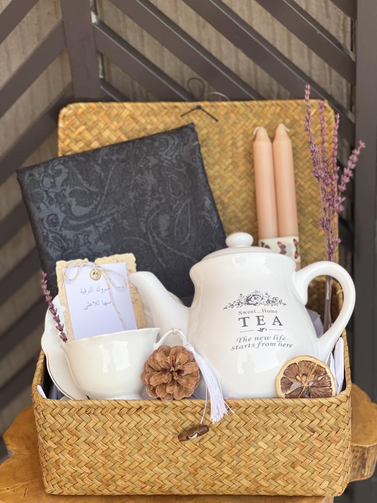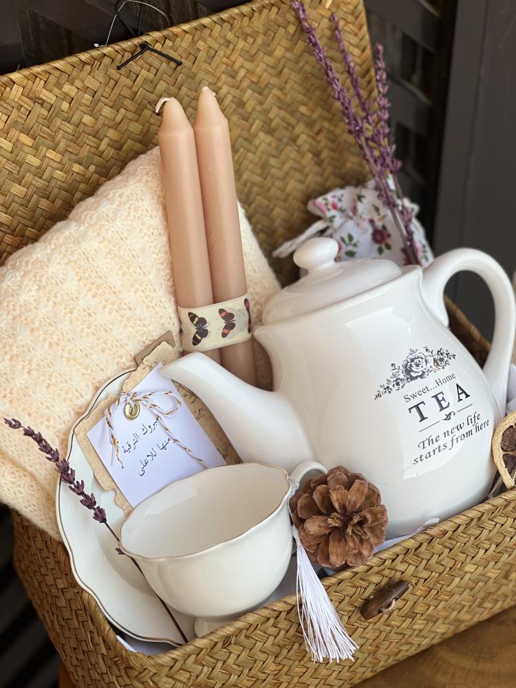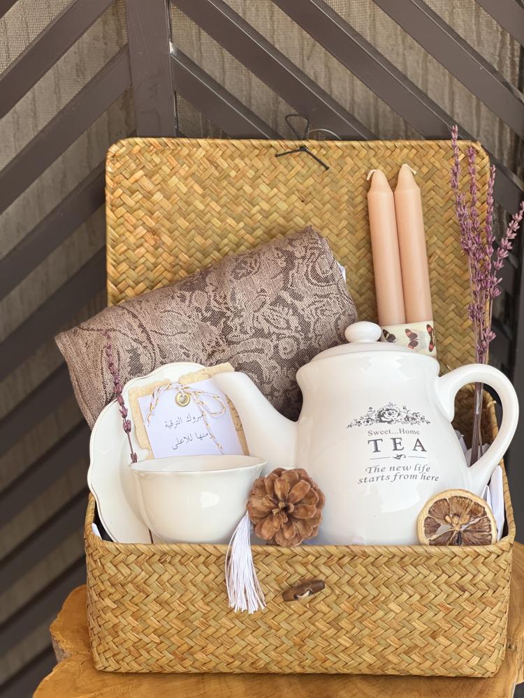 سلة من السعف بغطاء تحتوي : كوب مع طبق _ شموع معطرة _ابريق سويت هوم _شال شتوي _ كيس قماشي منوع من نوعين شاي او زنجبيل _ حزمه لافندار _كارد اهداء