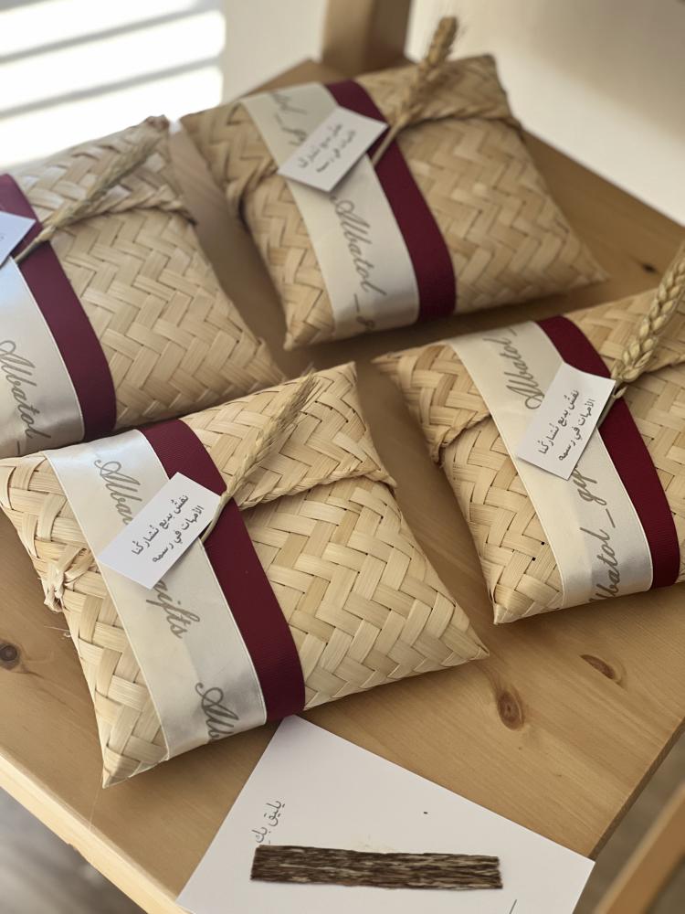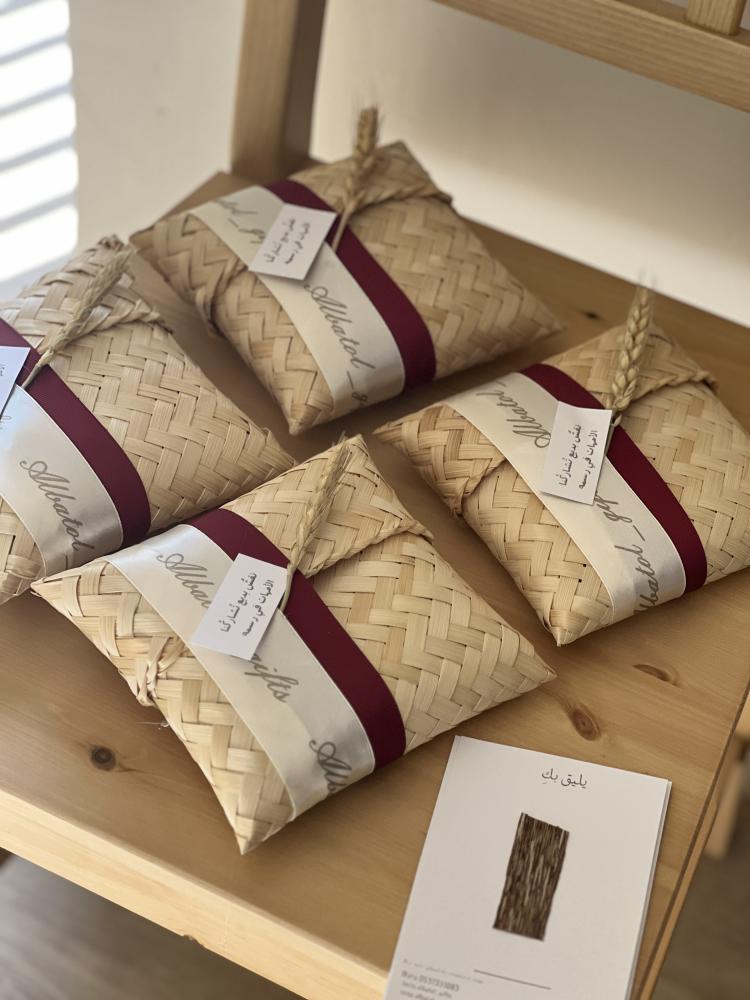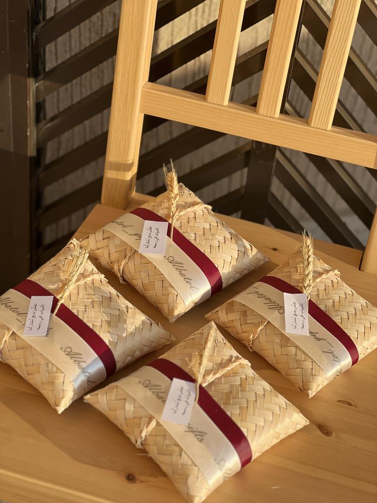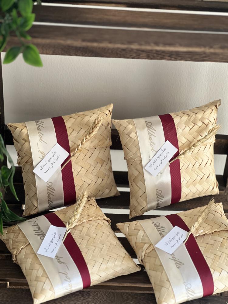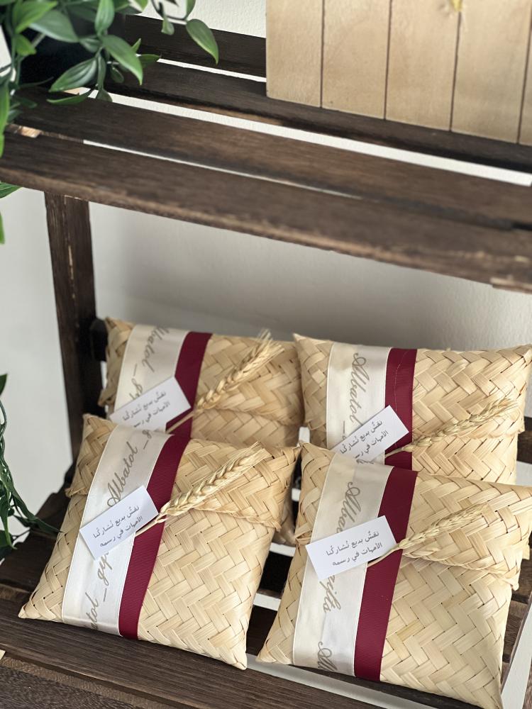 شنط من السعف مع عبارة خسب الطلب وسنابل القمح ومزينه بشريط