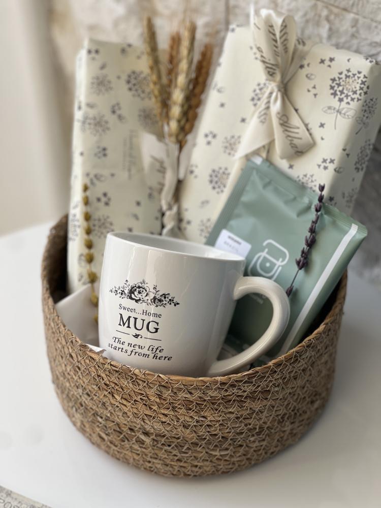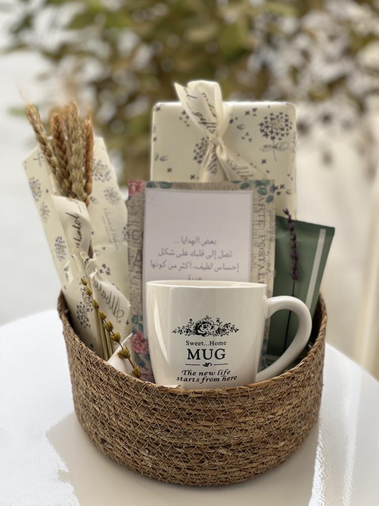 سلة من السعف تحتوي : كوب سويت هوم _ صحن سويت هوم _ظرف قهوة _مجموعه حامل شموع زحاج ٣ حبات _سنابل القمح _كارد اهداء