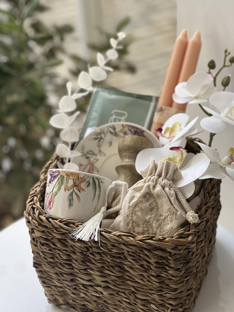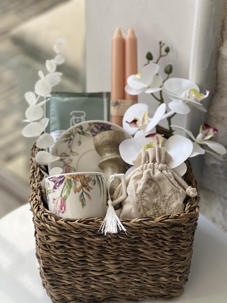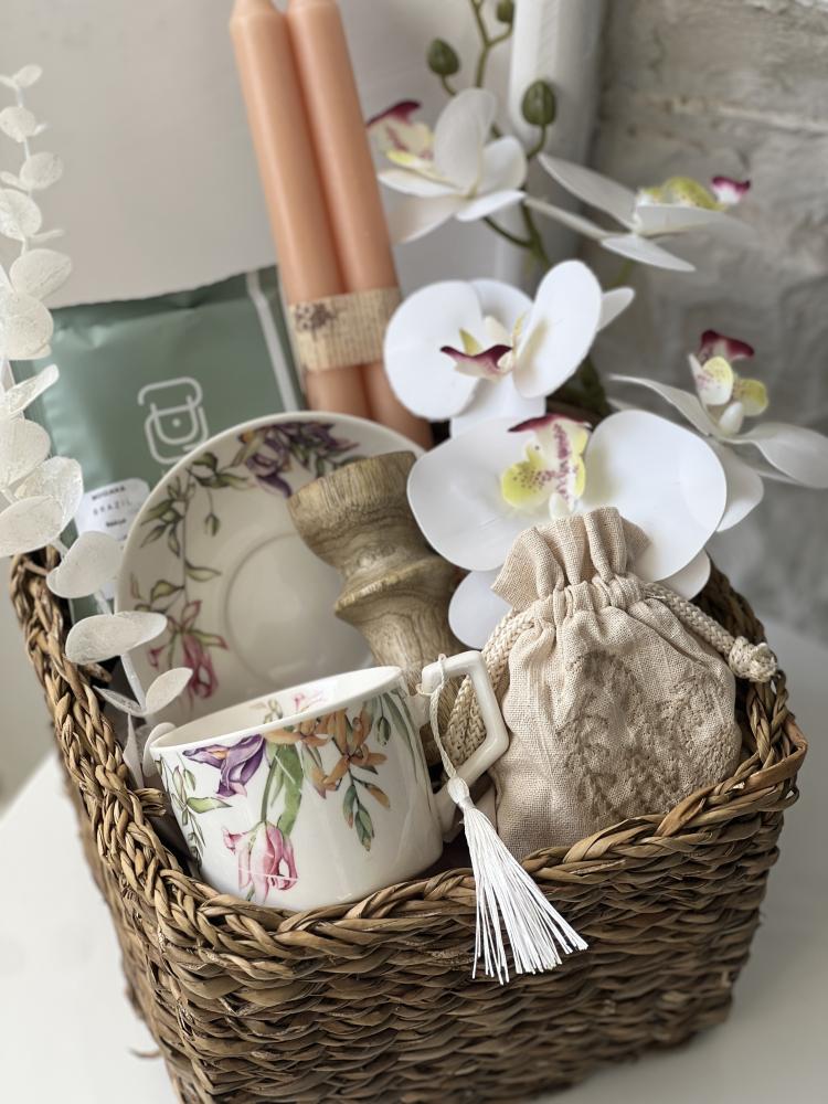 سلة من السعف تحتوي : كوب مع طبق _ كيس قماشي داخله اظرف شاي منوعه ٢ _ حامل شموع خشبي _شموع ابيض _ظرف قهوة جرن _اوركيد _كارد اهداء